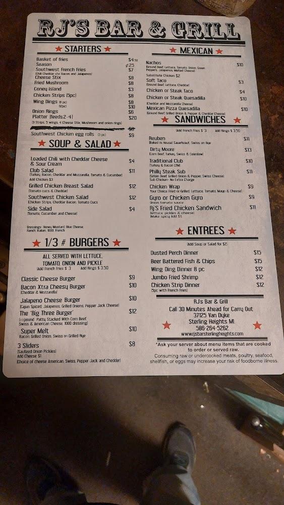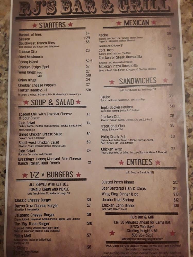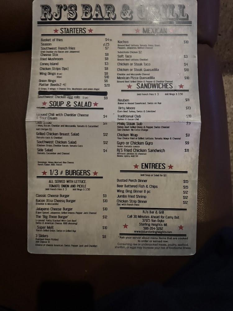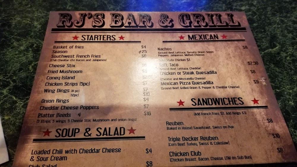 RJ’s Bar & Grill has a diverse menu catering to many tastes. Starters include a variety of fries, cheese sticks, and fried mushrooms. For those craving something hearty, satisfaction awaits in the burger selection, with classics like the Bacon Xtra Cheesy Burger. Sandwich lovers will appreciate the Chicken Club and Philly Steak Sub. Don't miss the Dusted Perch Dinner or the Beer Battered Fish & Chips. Menu highlights also include mouthwatering nachos and tacos for those in the mood for Mexican flavors. Prices remain budget-friendly, making it accessible regardless of the occasion. Expect an average dish price around $7.67, offering great value for the quality. Those who love comfort food will find plenty to indulge in here.
